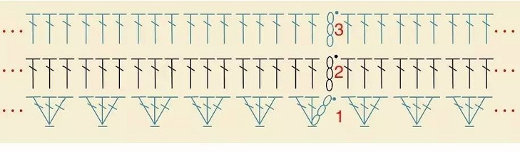 Схема завершения верхнего мотива и дальнейшего вязания пледа столбиками с накидом: